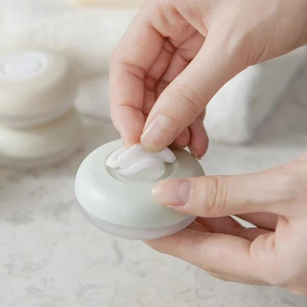 【トラベルポッド ポータブル】4個セット。丸型のローション収納ボックスは、ユニークなバックルと大口径デザインを採用し、注ぎやすく、出口はクロス開口部で、押すだけで液体が流れ出ます。省スペースで持ち運びも簡単。旅行、出張、デート、ハネムーン、パーティーなどに最適です。